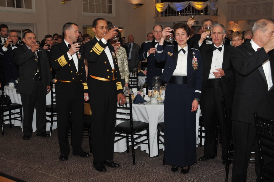 OMAHA, Neb. - U.S. Strategic Command leadership, including Vice Adm. Cecil D. Haney, USSTRATCOM deputy \rcommander; Gen. C. Robert Kehler, USSTRATCOM commander; and Maj. Gen. Susan Y. Desjardins, USSTRATCOM\rdirector, plans and policy, toast with various guests during the 111th Submarine Birthday Ball held April \r8 at the Scoular Building Ballroom.