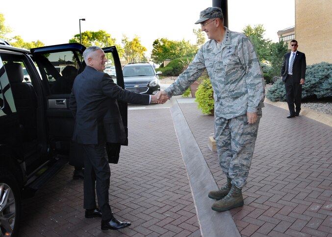 Secretary of Defense Jim Mattis (left) is greeted by U.S. Air Force Gen. John. E. Hyten, commander of U.S. Strategic Command (USSTRATCOM), upon his arrival at USSTRATCOM headquarters, Offutt Air Force Base, Neb., Sept. 14, 2017. During his visit, Secretary Mattis met with USSTRATCOM leadership to discuss strategic deterrence in the 21st century. This was Secretary Mattis’ first visit to USSTRATCOM as Secretary of Defense. One of nine Department of Defense unified combatant commands, USSTRATCOM has global missions assigned through the Unified Command Plan that include strategic deterrence, space operations, cyberspace operations, joint electronic warfare, global strike, missile defense, intelligence, and analysis and targeting. (USSTRATCOM photo by Steve Cunningham)