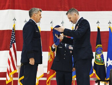 OFFUTT AIR FORCE BASE, Neb. - Maj. Gen. Jason Armagost, left, commander of 8th Air Force and Joint-Global Strike Operations Center, holds the guidon steady as Col. Patrick Hook, 595th Command and Control Group commander, furls the guidon during the 595th C2G inactivation ceremony, March 28, 2025, at Offutt Air Force Base, Nebraska. The 595th C2G was activated October 2016 to improve central management of the nuclear enterprise, and it created a clear line of communication between the president and members of nuclear task forces. (U.S. Air Force photo by Charles Haymond)