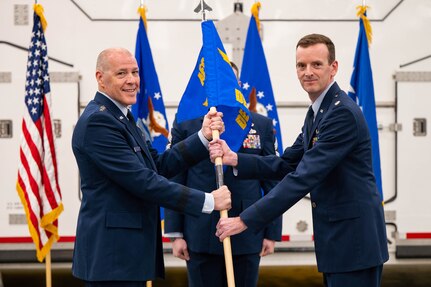 MALMSTROM AIR FORCE BASE, Mont. - U.S. Air Force Lt. Col. John Mayer, Sentinel Site Activation Task Force, Detachment 11 commander, accepts command of SATAF, Detachment 11 from Gen. Thomas Bussiere, commander of Air Force Global Strike Command, during the Sentinel SATAF activation ceremony April 4, 2025, at Malmstrom Air Force Base, Mont. The LGM-35A Sentinel intercontinental ballistic missile system is designed to replace the Minuteman III, marking a significant step in modernizing the land-based leg of the U.S. nuclear triad. This next-generation system will provide enhanced security, advanced capabilities, and sustained deterrence for decades to come. (U.S. Air Force Photo by Senior Airman Mary Bowers)